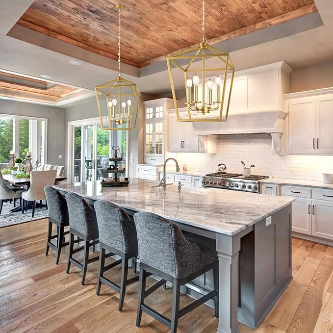- ✔【Durable for Use】The pendant light fixture is made of high-strength metal with a stable structure, much more durable for long term usage. Covered with gold paint, the kitchen light fixture will surely maintain its farmhouse appearance for many years without fading, rusting or corroding.