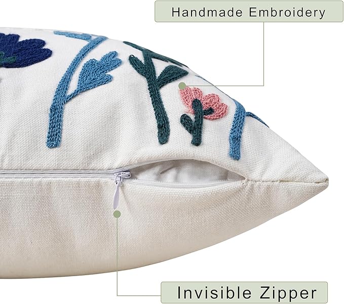 Merrycolor Embroidered Pillow Covers 18x18 Flower Pattern Decorative Throw Pillow Covers Comfortable Cotton Canvas Square Cushion Cases for Sofa Bed Living Room Decor
