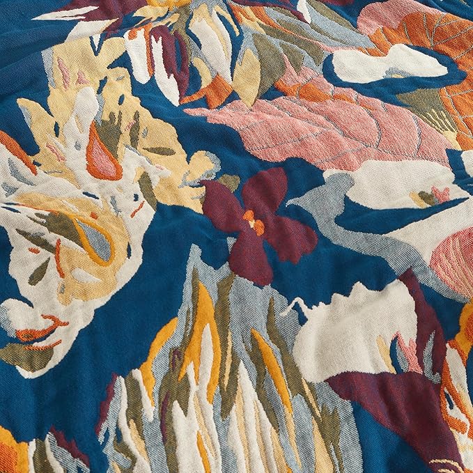 Boho Throw Blanket for Bed 90”x98”, 100% Cotton Woven Blanket for Couch Sofa, Ultra Soft 4-Layer Muslin Quilt with Vintage Floral Printed, Farmhouse Bed Blanket/Cover for Living Room Decor