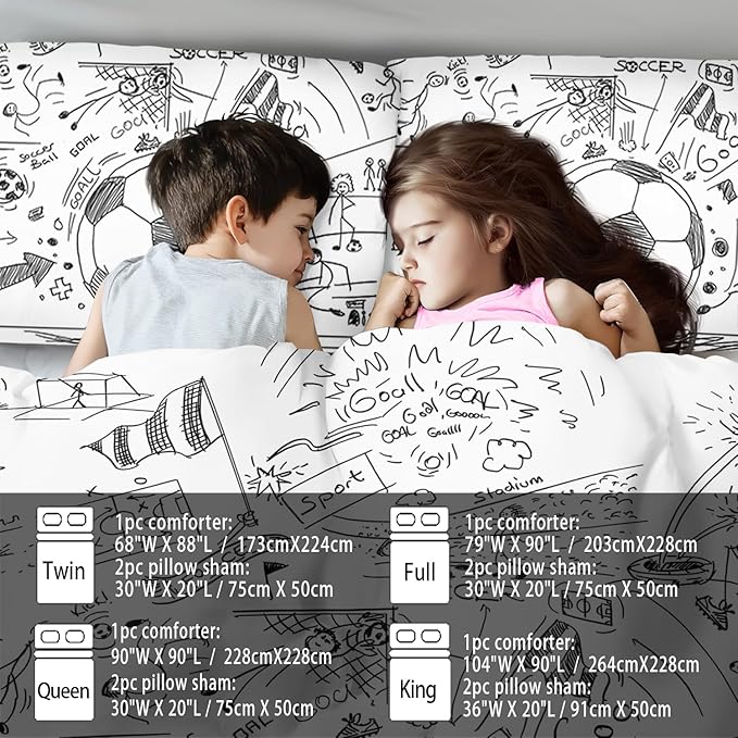 - Queen Size Soccer Comforter Set :This bedding set includes 1 comforter(67" x 85") and 2 pillowcases(20”x30”). In order to facilitate transportation, the quilt is made of vacuum compression technology. It will be slightly wrinkled when taken apart, but it will quickly regain its fluffiness if you gently beat it.