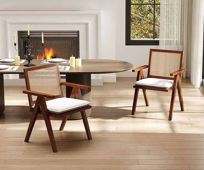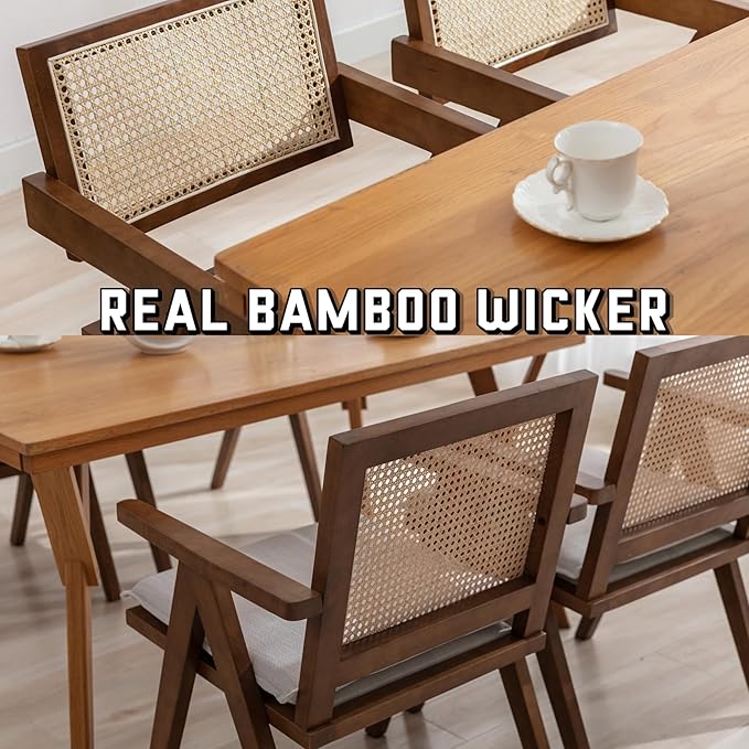 Rattan Dining Chairs Set of 2, Farmhouse Wicker Dining Chairs with Removable Linen Cushion Accent Cane Armchair for Dining Room Kitchen Restaurant, Walnut