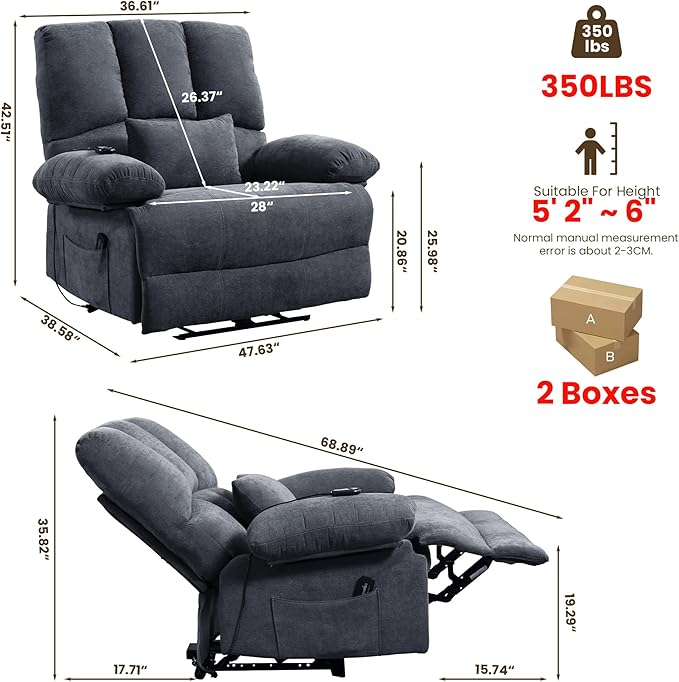 - WIDER RECLINER - This oversized recliner has been upgraded to a larger and wider size with a 28 inch seat width for adults. Overall size: 47 “W x 36 ”D x 46 "H.
