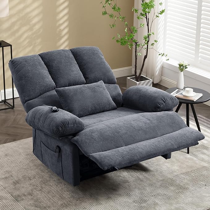 - COMFORT RECLINER - This oversized recliner comes with a massaging lumbar cushion that provides extra support for your lower back, making you more comfortable and relaxed at your leisure. Comes with 2 hidden cup holders that retract into the armrests when not in use.