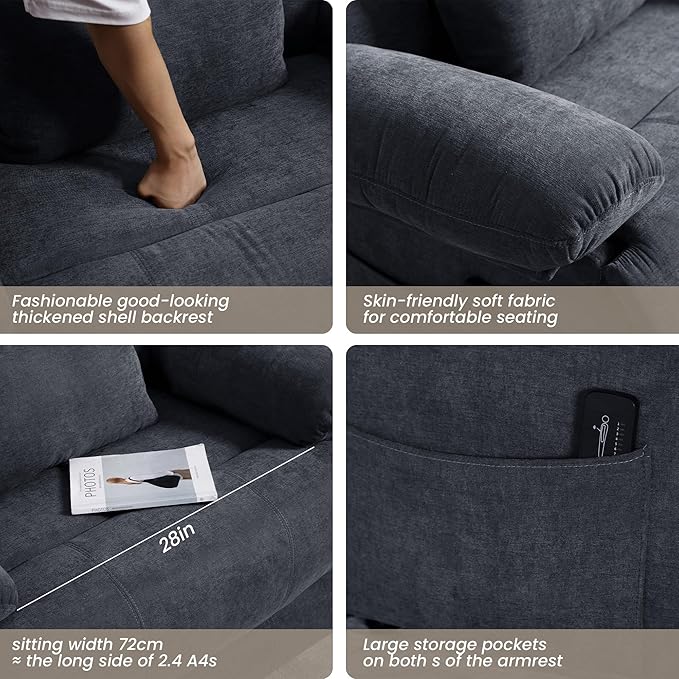 - OVERSTUFFED RECLINER - The cushion is spring loaded so it stays flexible and does not collapse easily after extended use. The wide armrests are padded for more comfortable support. Chenille fabric is soft and skin-friendly. This is the most comfortable recliner ever, perfect for napping.