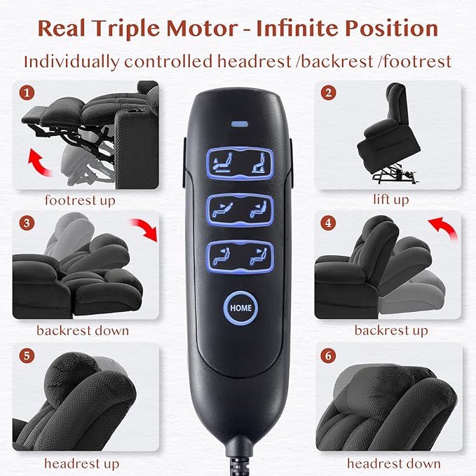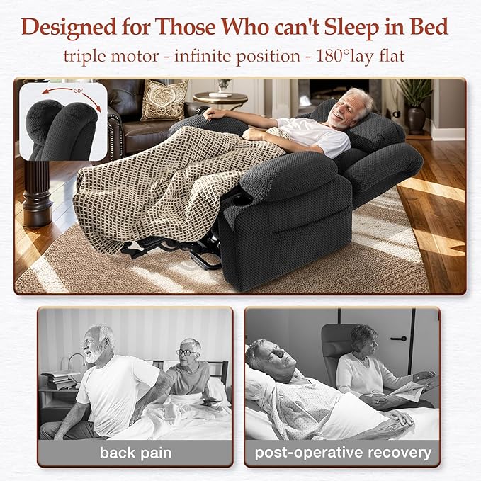 - Real Triple Motor & Infinite Position & 180° Lay Flat: Enjoy power lift recliner chair for elderly, individually controlled headrest /backrest /footrest separately, infinite adjusts 45° to 180° lay flat, designed for those who can't sleep in bed . Whether you're reading, watching TV, napping, sleeping, or standing up, this recliner lift chair meets all your needs