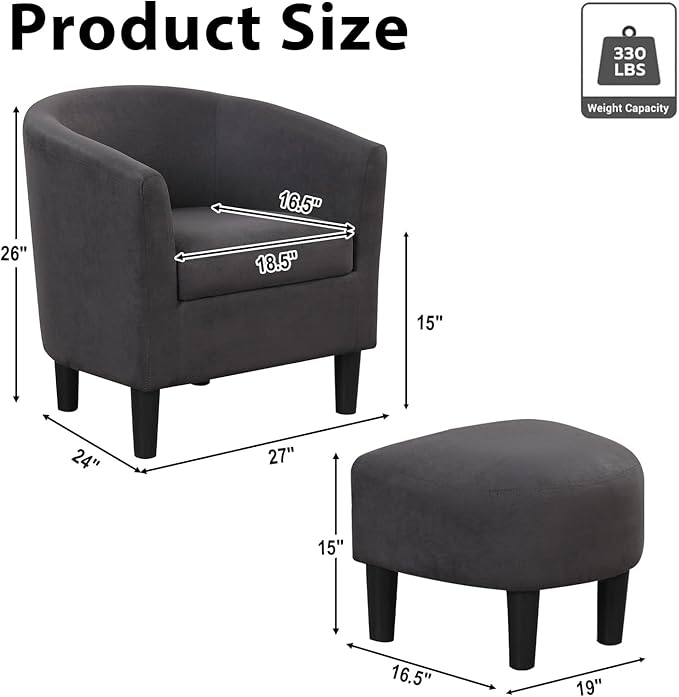 - Perfect Size - Overall accent chair dimension: 27"W*24"D*26"H, Ottoman:19"W*16.5"D*15"H. Maximum weight capacity: 330 lbs. It's good furniture for your living room, bedroom, den, recreation area, guestroom, small spaces apartment, office or studio.