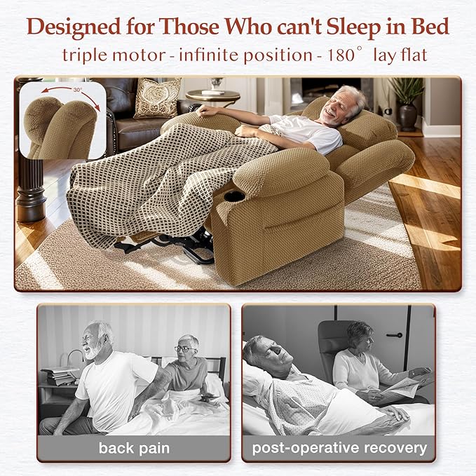 - Real Triple Motor & Infinite Position & 180° Lay Flat: Enjoy power lift recliner chair for elderly, individually controlled headrest /backrest /footrest separately, infinite adjusts 45° to 180° lay flat, designed for those who can't sleep in bed . Whether you're reading, watching TV, napping, sleeping, or standing up, this recliner lift chair meets all your needs