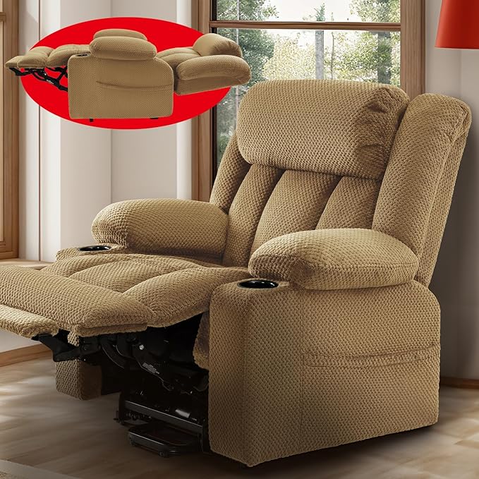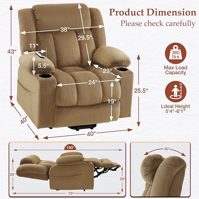 - Large Size for Big & Tall: Our power recliner chair suitable for big and tall 5'4”-6'1”, extended footrests to fully support your feet, prevent from dangling. The cushion 23"x24", providing ample space and comfort