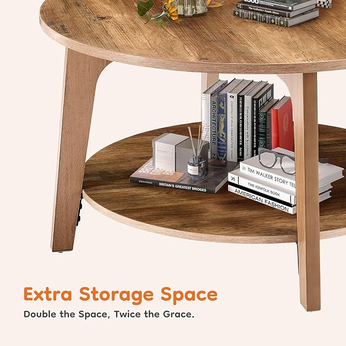 - Large 2-Tier Storage Space: Featuring a wide 31.5'' diameter tabletop and a 26.4'' lower shelf, this round coffee table provides generous space for everything from coffee mugs and snacks to magazines and decorative accents. The two-tier design helps you keep the living room tidy while displaying your style.